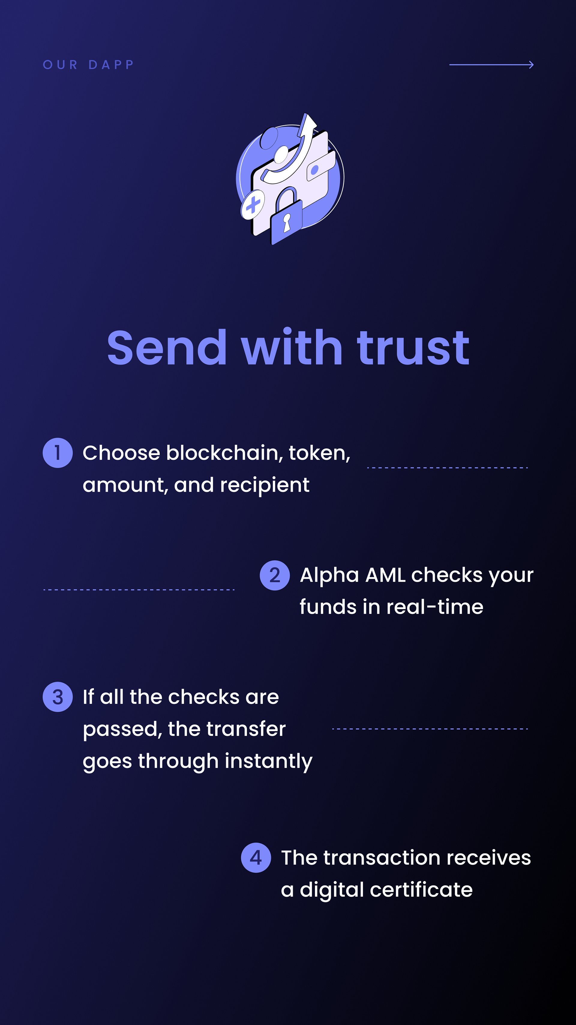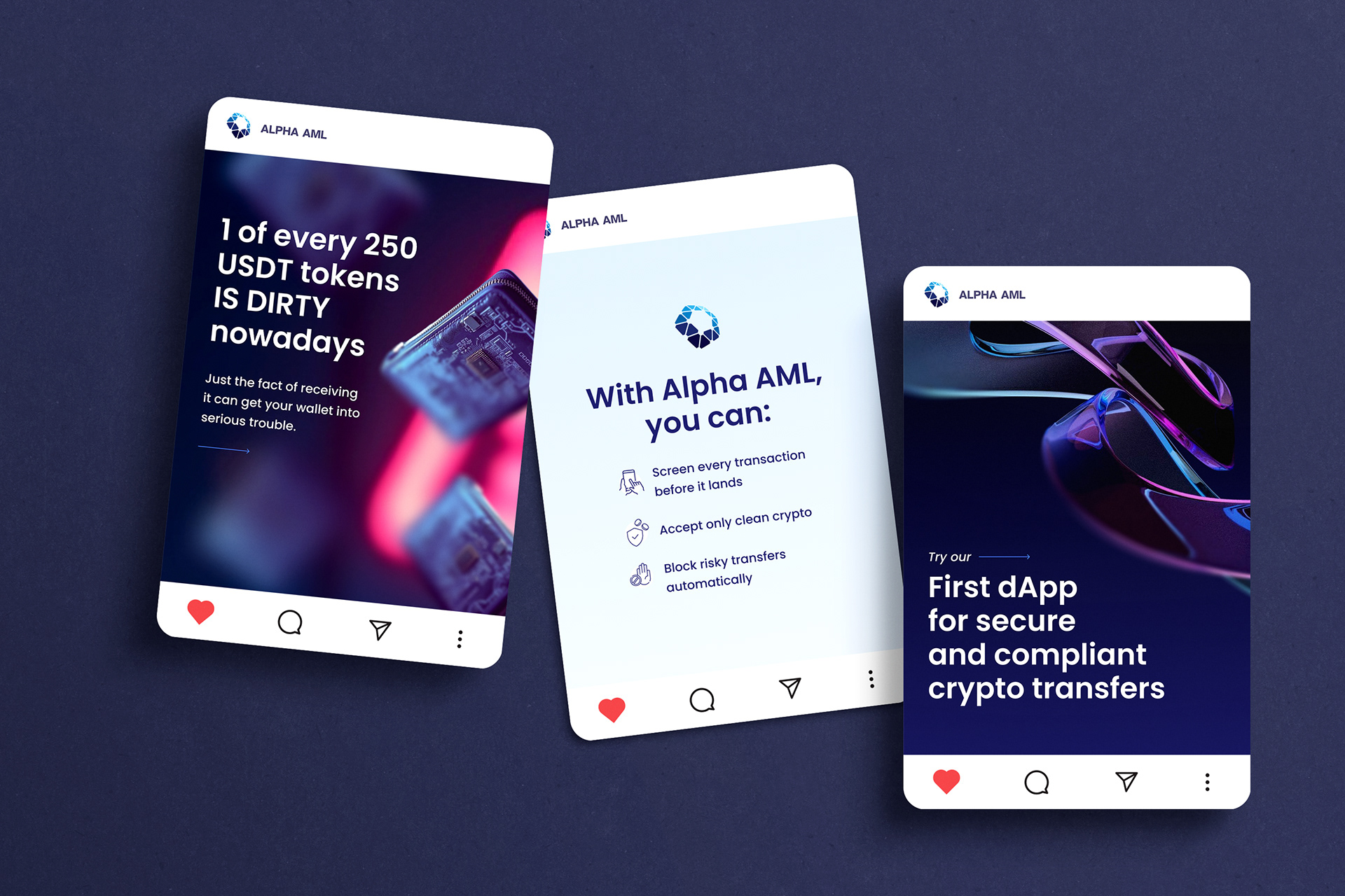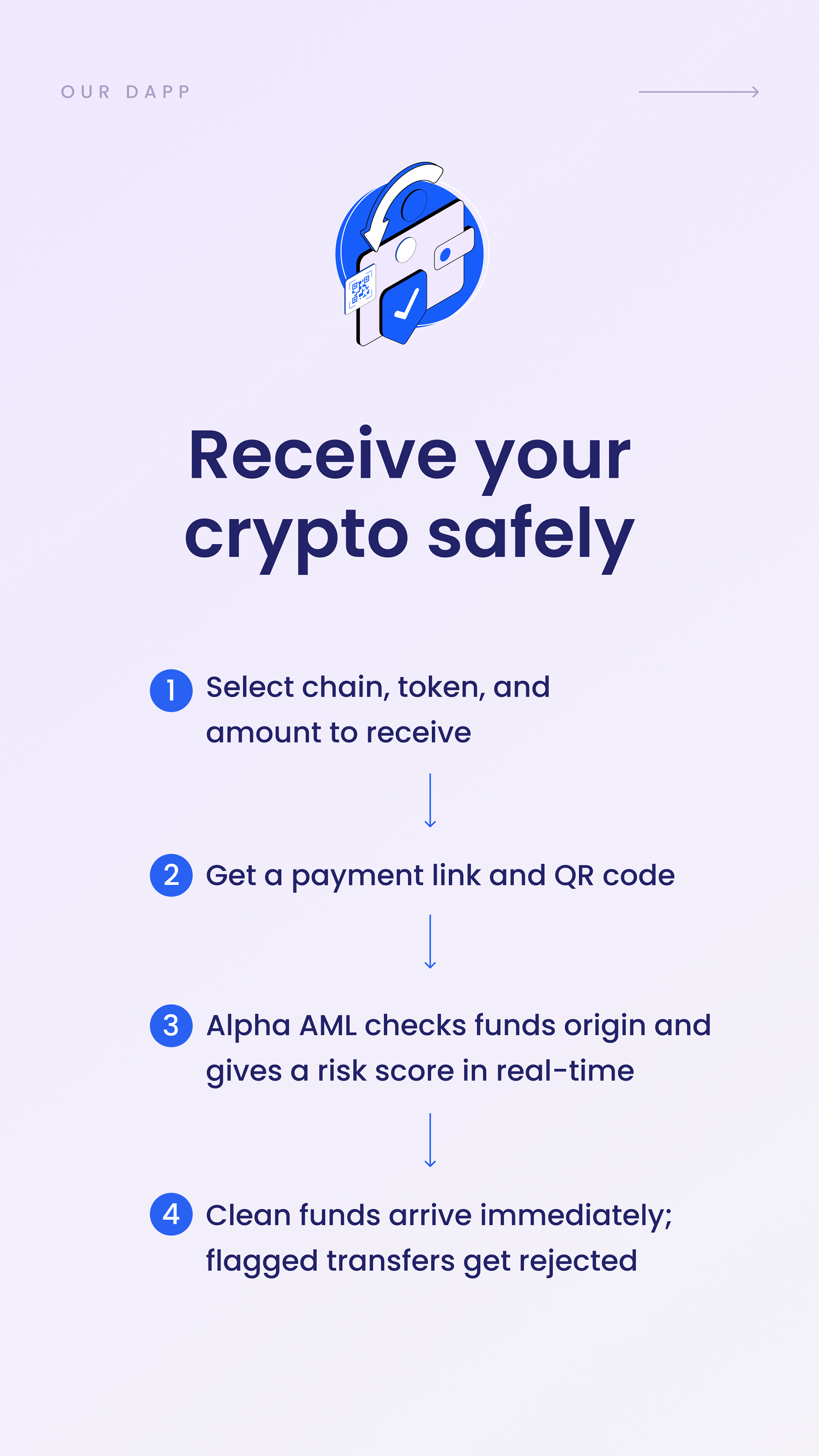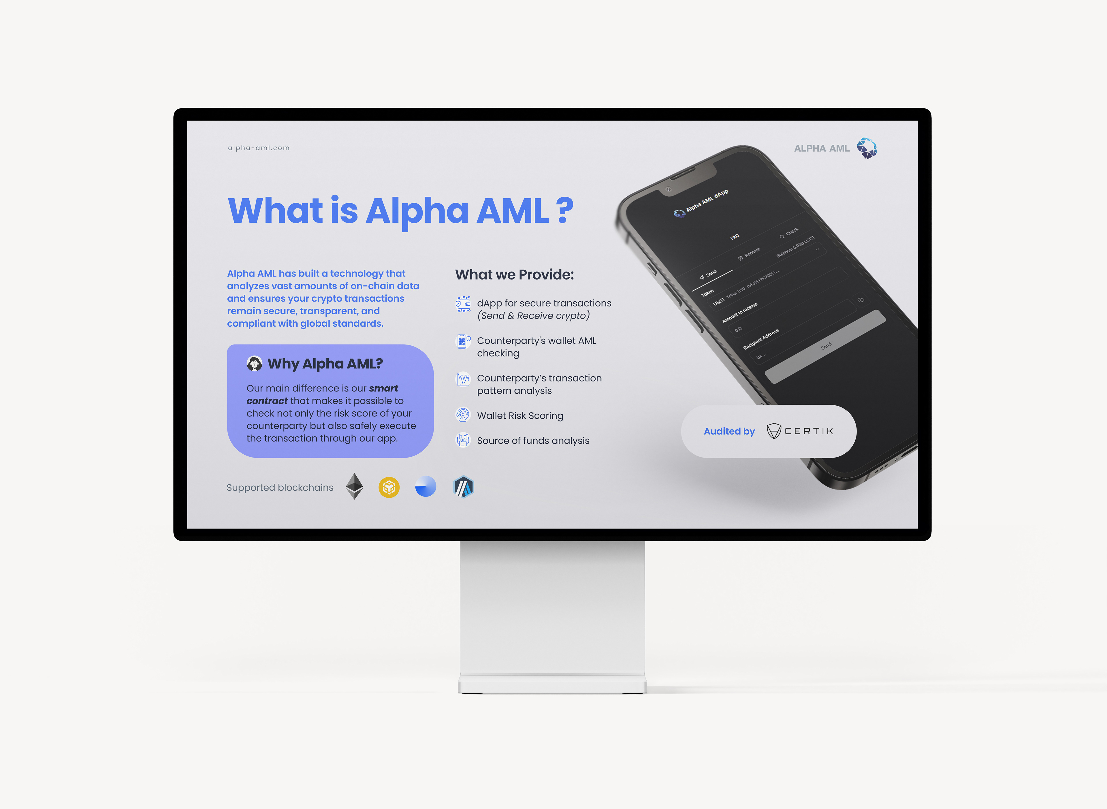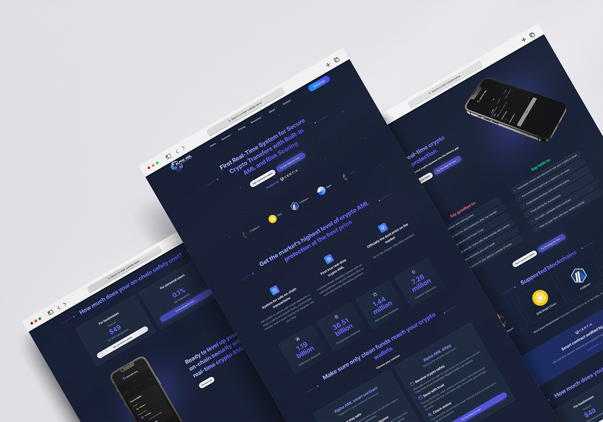 Alpha AML is a real-time on-chain compliance system that protects both businesses and everyday crypto users from receiving tainted funds. The platform combines a smart contract for companies and a user-friendly dApp, delivering instant AML screening, risk scoring, and secure transaction flow across multiple blockchains – all at a significantly lower cost than traditional solutions.